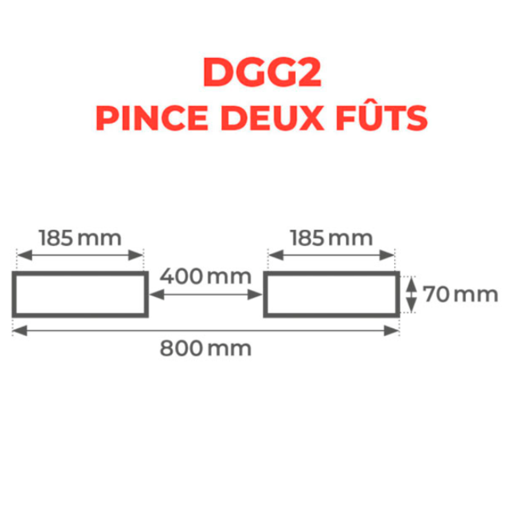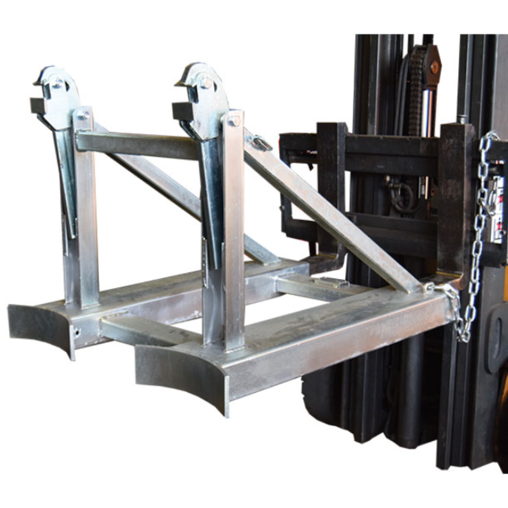 Le système repose sur une pince de préhension automatique qui se verrouille d’elle-même sur le rebord du fût lors de la levée. Cette mécanique assure une force de serrage très élevée, garantissant que le fût reste parfaitement maintenu durant toute la phase de transfert. L’accessoire s’installe facilement dans les fourreaux de dimensions $185 \times 70$ mm et se sécurise via une chaîne de sécurité reliée au tablier du chariot élévateur.