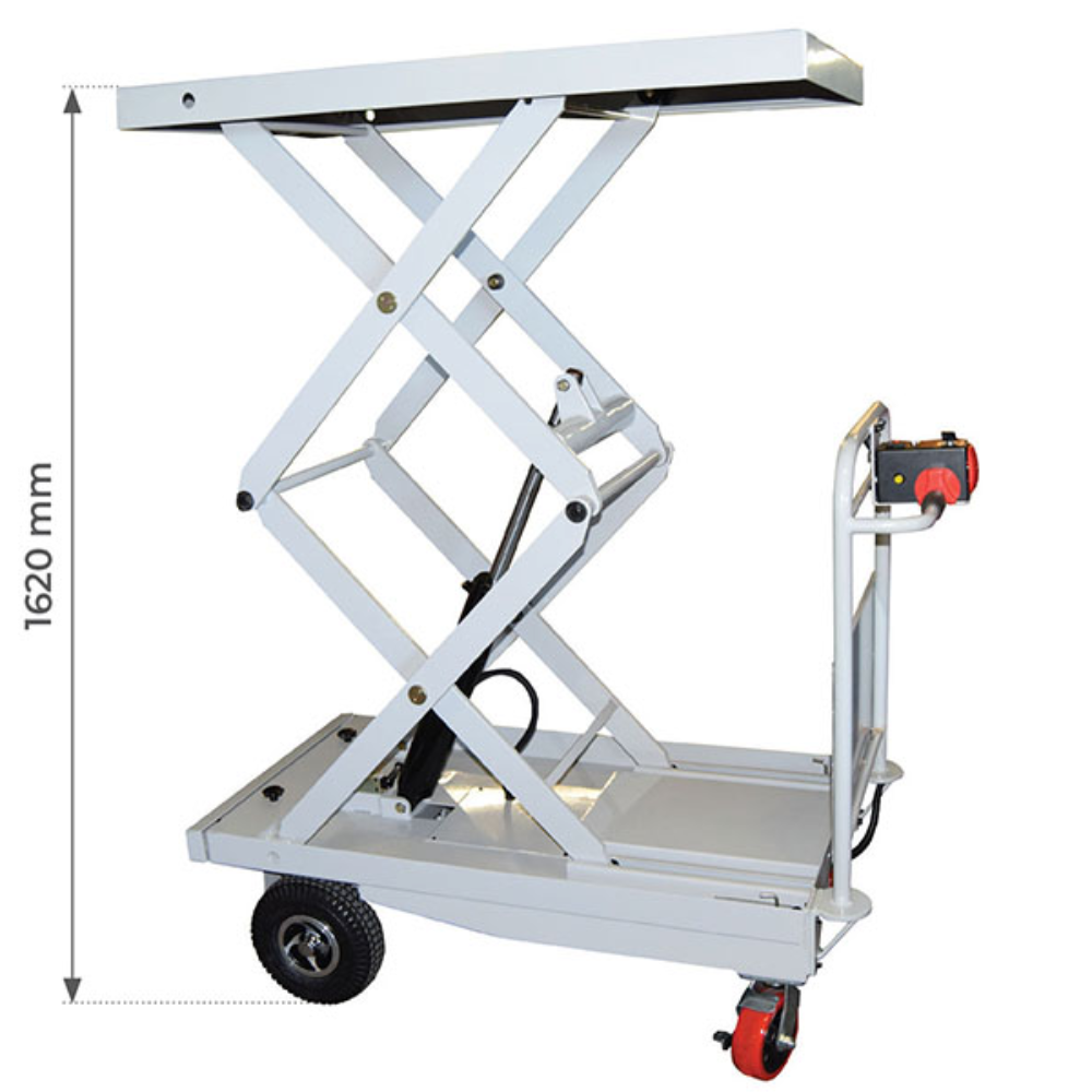 Amplitude de travail exceptionnelle : Sa plateforme s’élève jusqu’à 1620 mm, permettant un ajustement parfait à la hauteur de vos machines ou de vos rayonnages pour un confort de travail optimal.