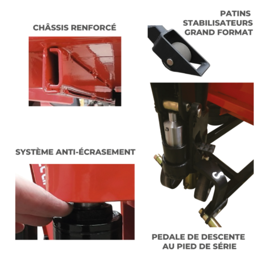 Ce modèle est doté d’une pompe hydraulique monocylindre équipée de joints de fabrication allemande pour une longévité et une souplesse d’utilisation supérieures. Le système propose deux vitesses de levage pour s’adapter à la charge, avec un effort à la pompe réduit. Pour une sécurité totale, deux stabilisateurs latéraux bloquent automatiquement l’appareil dès que l’élévation dépasse 400 mm, garantissant une excellente stabilité.